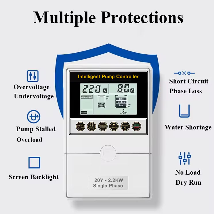| Protecciones | Protección contra parada de bomba Protección contra funcionamiento en seco Protección contra sobrecarga Protección contra subtensión Protección contra sobretensión Protección de fase abierta Protección contra cortocircuitos |